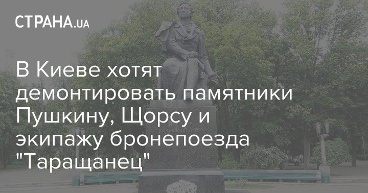 В Киеве хотят демонтировать памятники Александру Пушкину, Николаю Щорсу и экипажу бронепоезда "Таращанец".