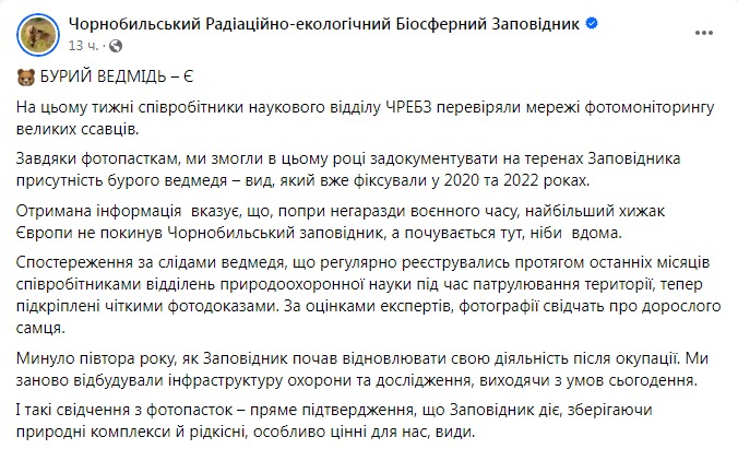 Полученная информация указывает на то, что, несмотря на невзгоды военного времени самый большой хищник Европы не покинул Чернобыльский заповедник, а чувствует себя там как дома.