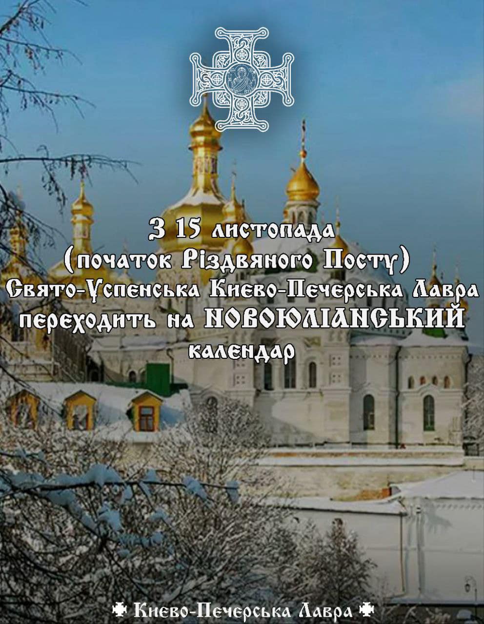 Киево-Печерская лавра приняла решение перейти на новоюлианский календарь, как это сделала Православная церковь Украины. Лавра начнет использовать новый календарь с 15 ноября, в первый день рождественского поста.