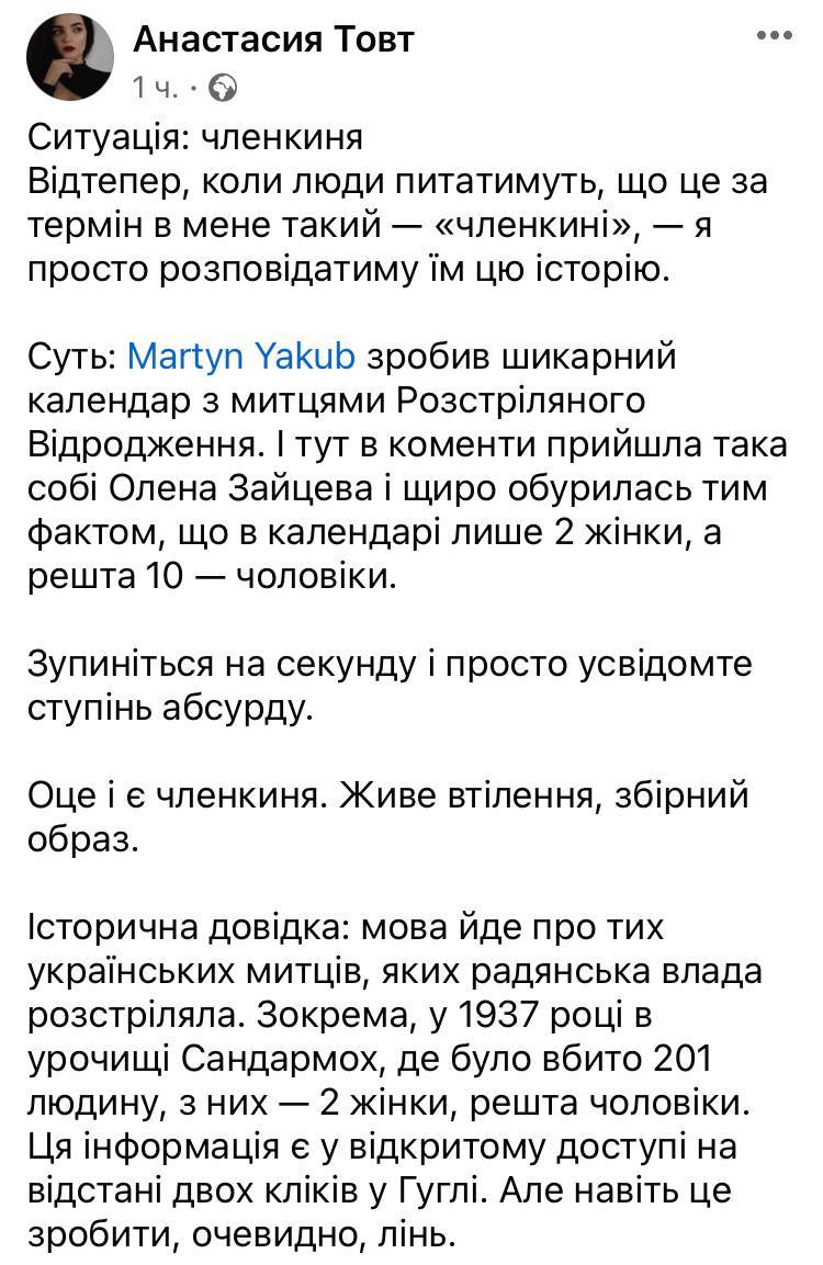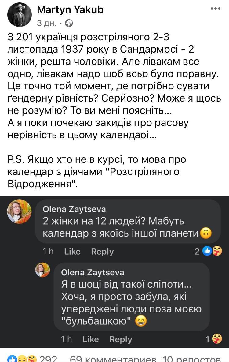 Комментарии Елены Зайцевой, намекающие на гендерную дискриминацию в календаре, активно обсуждают в украинском сегменте Фейсбука.