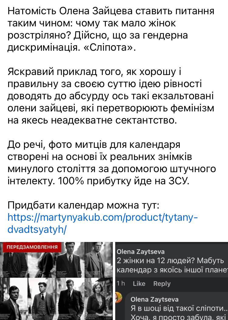 Автор календаря Мартин Якуб отреагировал на реплику Зайцевой так: "Это точно тот момент, где нужно совать гендерное равенство?"