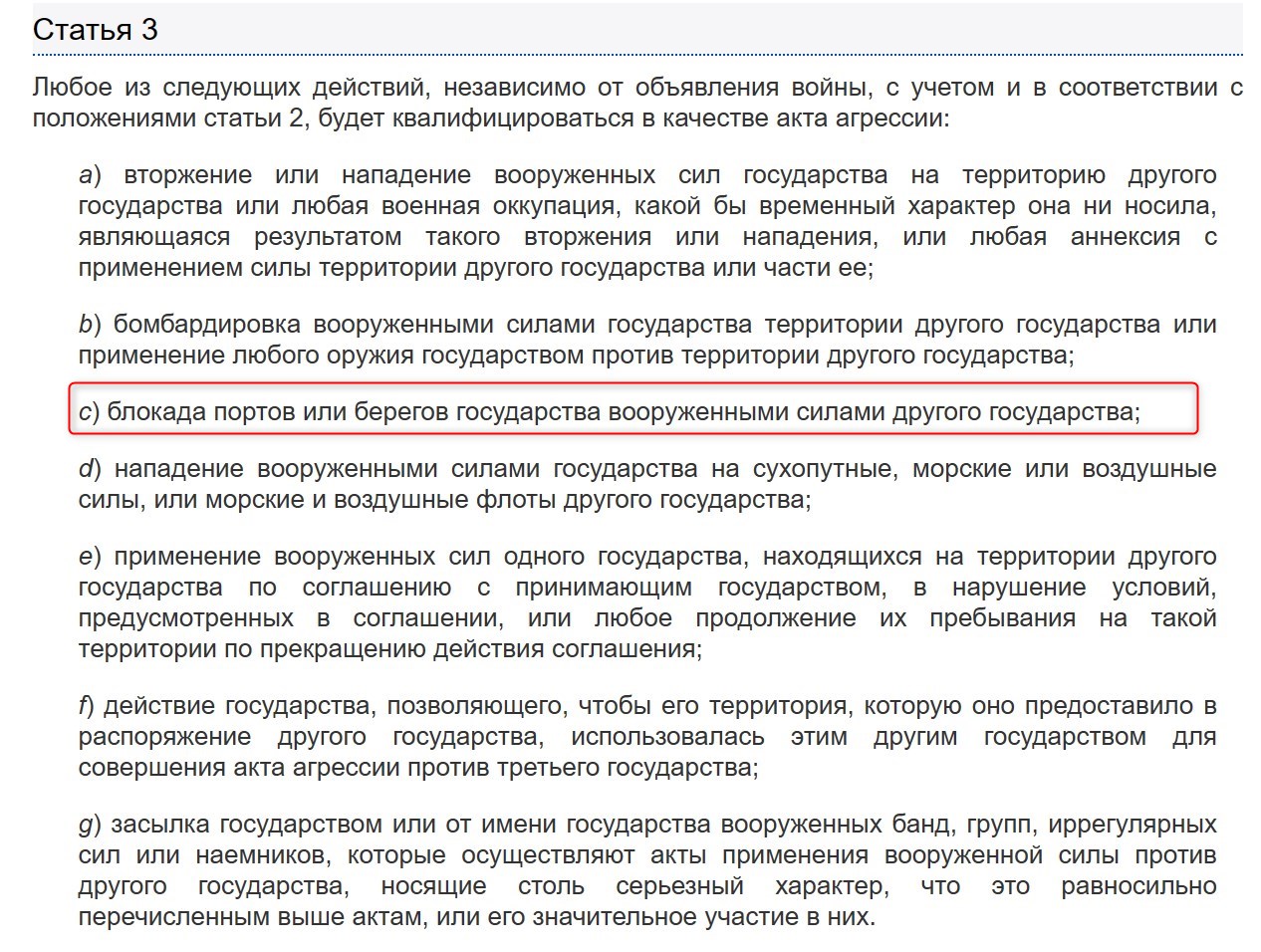 Отметим, что по международному праву морская блокада приравнивается к акту агрессии и может являться поводом для объявления войны. Ниже - статья 3 из резолюции 3314 (ХХIХ) Генеральной ассамблеи ООН от 14 декабря 1974 года, которой было утверждено определение агрессии.