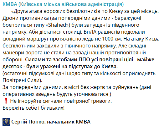 "Вторая атака вражеских беспилотников по Киеву за этот месяц. Дроны противника (по предварительным данным – баражирующие боеприпасы типа "Shahed") были запущены с южного направления. Чтобы добраться до столицы, БпЛА рашистов преодолели сложный маршрут протяженностью чуть ли не 1000 км. В атаку Киева беспилотники заходили с северного направления. Но сложные маневры врага не помешали нашей противовоздушной обороне. Силами и средствами ПВО все воздушные цели – почти десяток – были поражены на подступах к Киеву", - сообщил глава КГВА Сергей Попко.