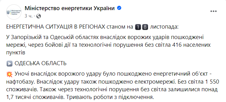 Напомним, ночью было попадание по объекту энергетики под Одессой.