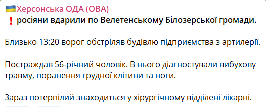 14:53 Сегодня днем российские военные ударили по Велетенскому Белозерской громады. Об этом сообщает Херсонская ОВА.