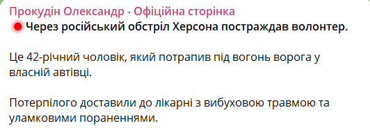 15:24 В результате российских обстрелов Херсона пострадал волонтер. Об этом сообщил глава Херсонской ОВА Александр Прокудин.