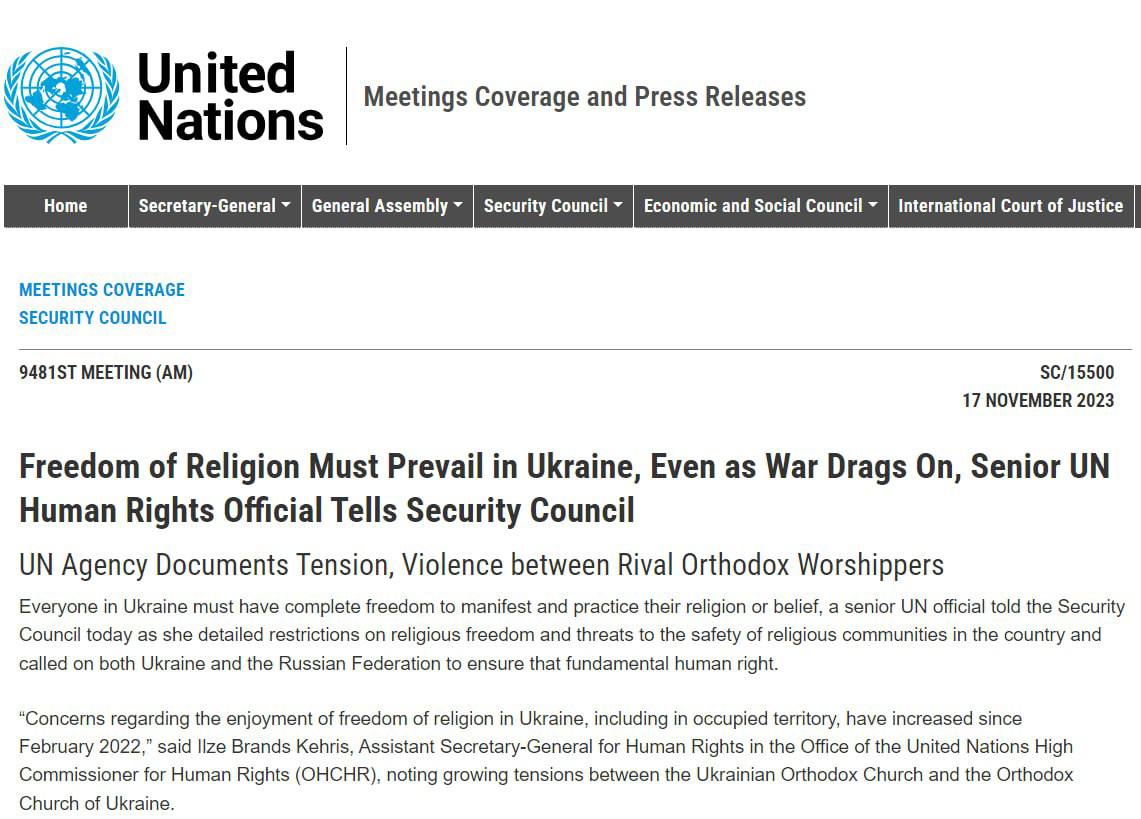 "УВКПЧ ООН внимательно следит за тем, как законодательные изменения в Украине могут повлиять на реализацию свободы религии. Управление ранее выражало обеспокоенность по поводу действий правительства, направленных против Украинской православной церкви, которые могут носить дискриминационный характер", - заявила помощник генерального секретаря по правам человека Управления Верховного комиссара Организации Объединенных Наций по правам человека (УВКПЧ) Ильзе Брандс Кехрис.