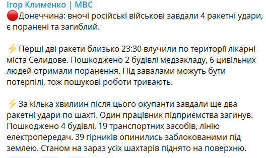 "Через несколько минут после этого оккупанты нанесли еще два ракетных удара по шахте. Один работник предприятия погиб. Повреждены 4 здания, 19 транспортных средств, линия электропередач. 39 горняков оказались заблокированы под землей", - добавил Клименко.
