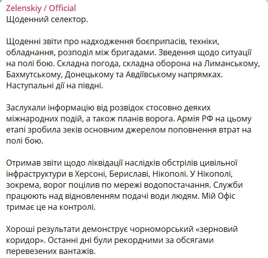 "Сложная погода, сложная оборона на Лиманском, Бахмутском, Донецком и Авдеевском направлениях. Наступательные действия на юге", - написал президент.