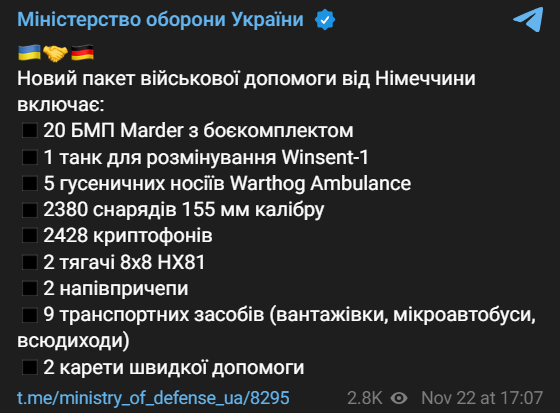 Напомним, 21 ноября министр обороны ФРГ Борис Писториус объявил о новом пакете помощи для Украины на сумму 1,3 миллиарда евро.
