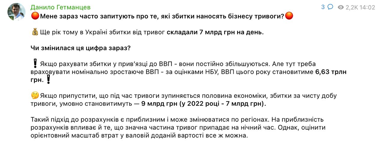 "Если говорить о налогах, то потери от остановки экономической деятельности для бюджета составляют — 3 млрд грн в сутки вынужденного простоя. Если взять минимальную суммарную продолжительность тревог в 2 суток в месяц, потери сводного бюджета и пенсионного фонда могут достигать 6 млрд грн/месяц", - сообщает Гетманцев.