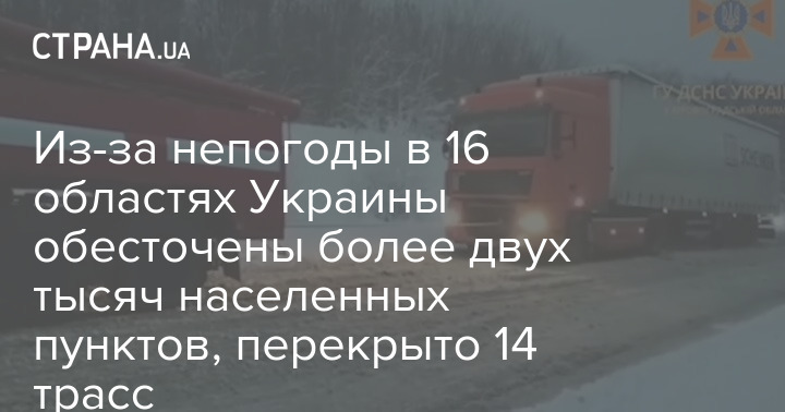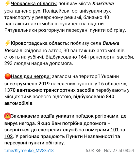 Утром 27 ноября в МВД опубликовали сводку о ликвидации последствий непогоды на территории Украины. Перекрыты 14 трасс, в 16 областях обесточено 2 019 населенных пунктов.