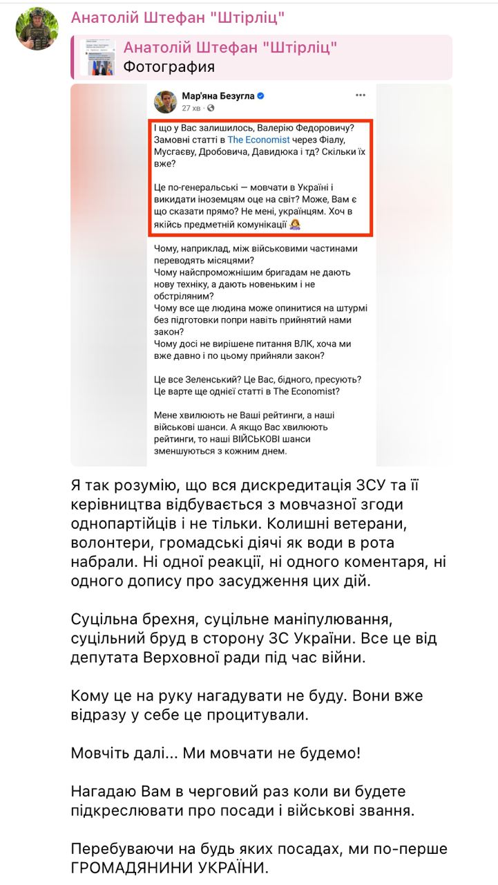 "Бывшие ветераны, волонтеры, общественные деятели как воды в рот набрали. Ни одной реакции, ни одного комментария, ни одного сообщения об осуждении этих действий. Сплошная ложь, манипулирование, сплошная грязь в сторону ВС Украины. Все это от депутата Верховной Рады во время войны. Кому это на руку напоминать не буду. Они уже сразу у себя это процитировали. Молчите дальше... Мы не будем молчать!", - заявил Штефан.
