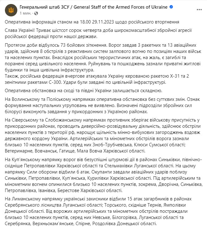 Вечером 29 ноября Генштаб ВСУ обнародовал сводку о ситуации на фронте.