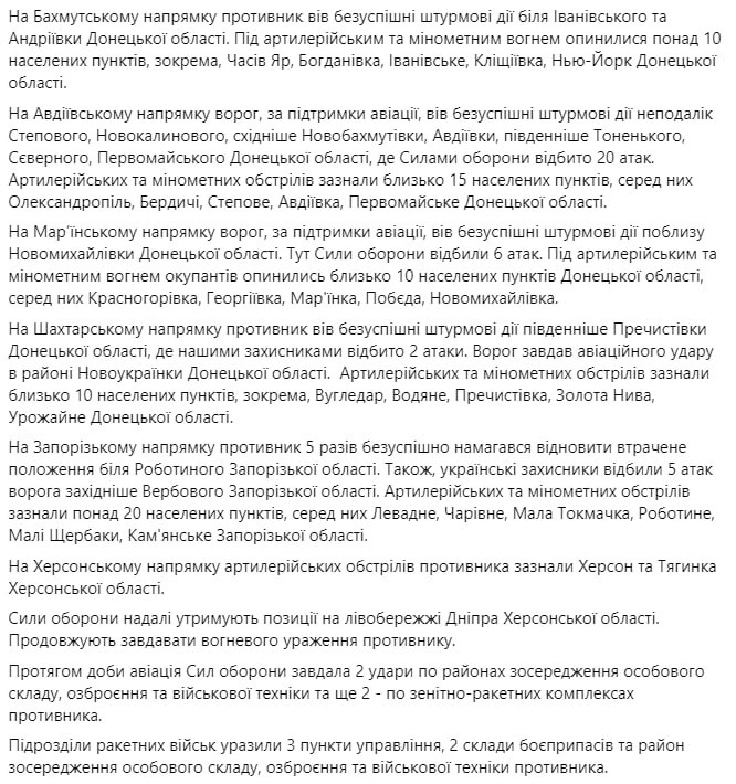 На Авдеевском направлении враг, при поддержке авиации, вел безуспешные штурмовые действия недалеко от Степного, Новокалинового, восточнее Новобахмутовки, Авдеевки, южнее Тоненького, Северного, Первомайского Донецкой области, где Силами обороны отбито 20 атак.