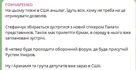 "На этой неделе в США аншлаг. Едут все, кому не нужно на это получать разрешения. Стефанчук собирается встретиться с новым спикером Палаты представителей. Также должен прилететь Ермак, в среду у него запланированы встречи. В четверг будет проходить оборонный форум, где будет присутствовать Рустем Умеров", - пишет Гончаренко.