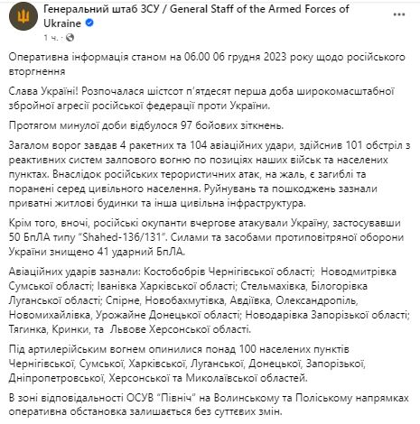 В среду, 6 декабря, Генштаб ВСУ обнародовал сводку о ситуации на фронте.