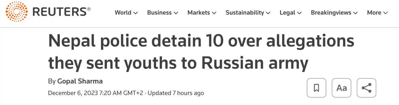 Власти Непала уже призвали Россию не вербовать своих граждан на войну в Украину и отправить всех ранее завербованных домой. В Украине, по данным непальских властей, погибли уже шестеро граждан Непала. Также телеграм-каналы пишут, что восемь непальцев заключили контракты с минобороны РФ, но затем сбежали со службы и теперь объявлены в розыск. Россия платит непальцам за участие в войне по 195 тысяч рублей в месяц.