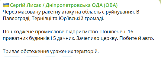 "Из-за массированной ракетной атаки на область есть разрушения в Павлограде, Терновке и Юрьевской громаде", - написал он.