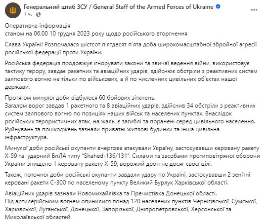 За прошедшие сутки российские оккупанты атаковали Украину, применив управляемую ракету Х-59 и ударный БпЛА типа Shahed-136/131. Они были уничтожены.