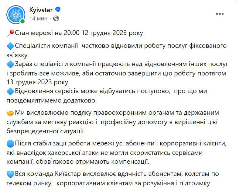 Как сообщил гендиректор компании, из-за кибератаки у "Киевстара" была частично разрушена IT-инфраструктура. По его словам, специалисты компании не имеют удалённого доступа к системам, так как весь виртуальный периметр, который защищает специальная программа, полностью разрушен. Приходится физически подключаться через патч-коды к каждому элементу сети, чтобы диагностировать степень нанесенного ущерба.