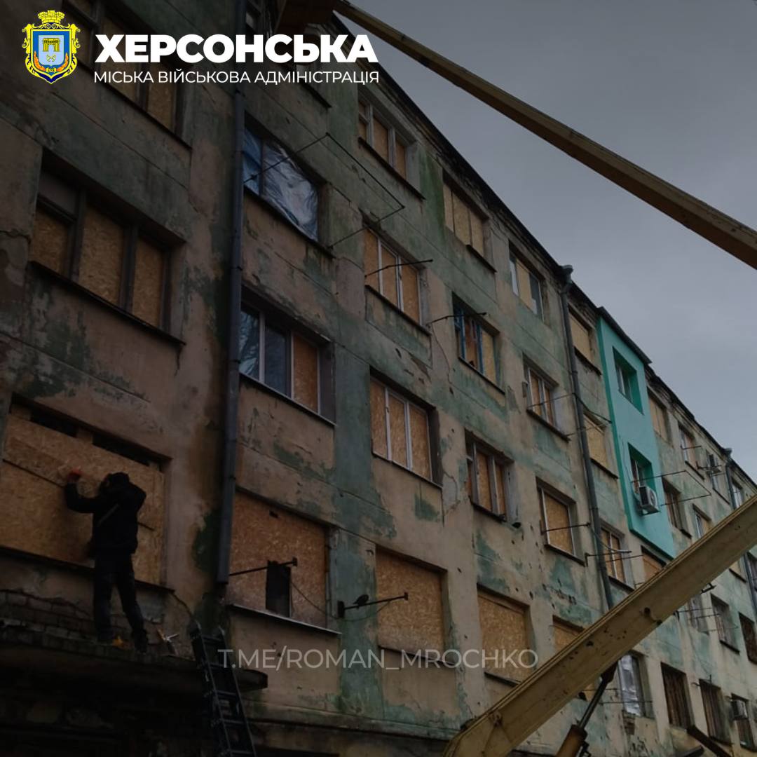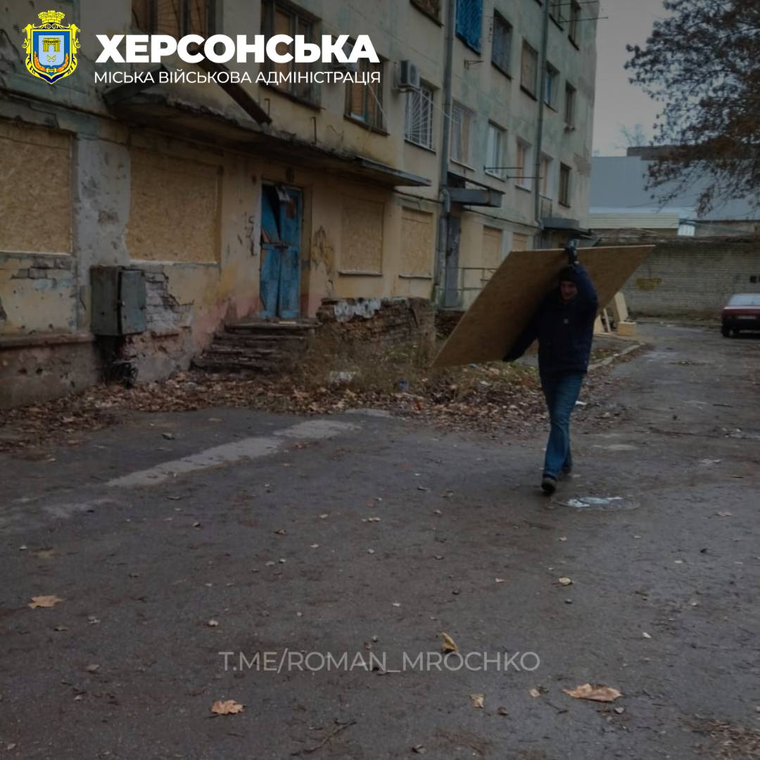 Глава Херсонской городской военной администрации Роман Мрочко опубликовал фото работ по заделыванию окон многоэтажек листами ДВП (древесноволокнистыми плитами).