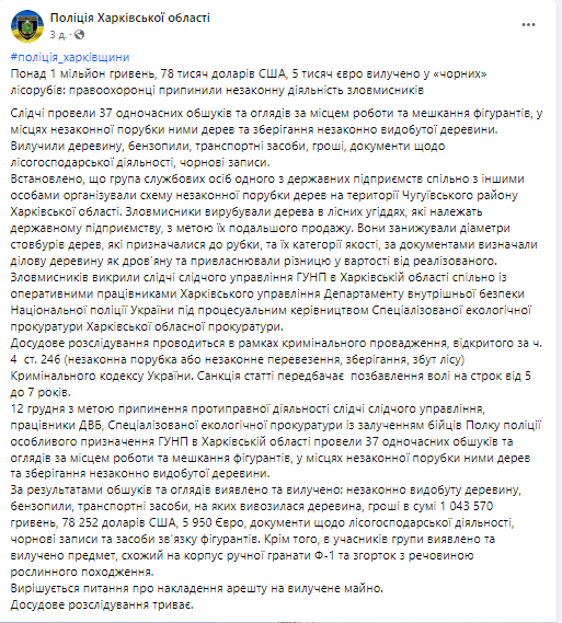 По результатам обысков и осмотров обнаружены и изъяты: незаконно добытая древесина, бензопилы, транспортные средства, на которых вывозилась древесина, деньги в сумме 1 043 570 гривен, 78 252 долларов США, 5 950 Евро, документы по лесохозяйственной деятельности, черновые записи и средства фигурантов. Кроме того, у участников группы обнаружен и изъят предмет, похожий на корпус ручной гранаты Ф-1 и сверток с веществом растительного происхождения.
