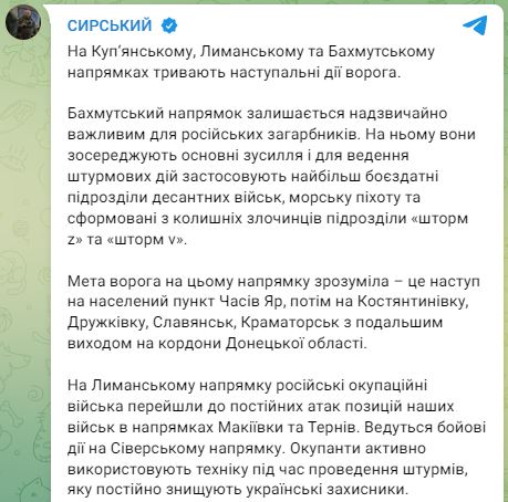 По словам Сырского, цель врага на этом направлении – наступление на Часов Яр, затем на Константиновку, Дружковку, Славянск, Краматорск с последующим выходом на границы Донецкой области.
