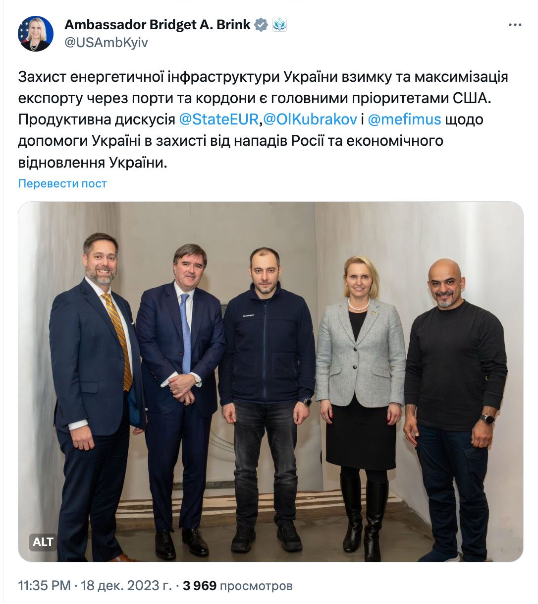 "Защита энергетической инфраструктуры Украины зимой и максимизация экспорта через порты и границы являются главными приоритетами США. Продуктивная дискуссия о том, как помочь Украине защититься от атак России и ускорить восстановление ее экономики", - подписала Бринк фото с украинскими чиновниками.