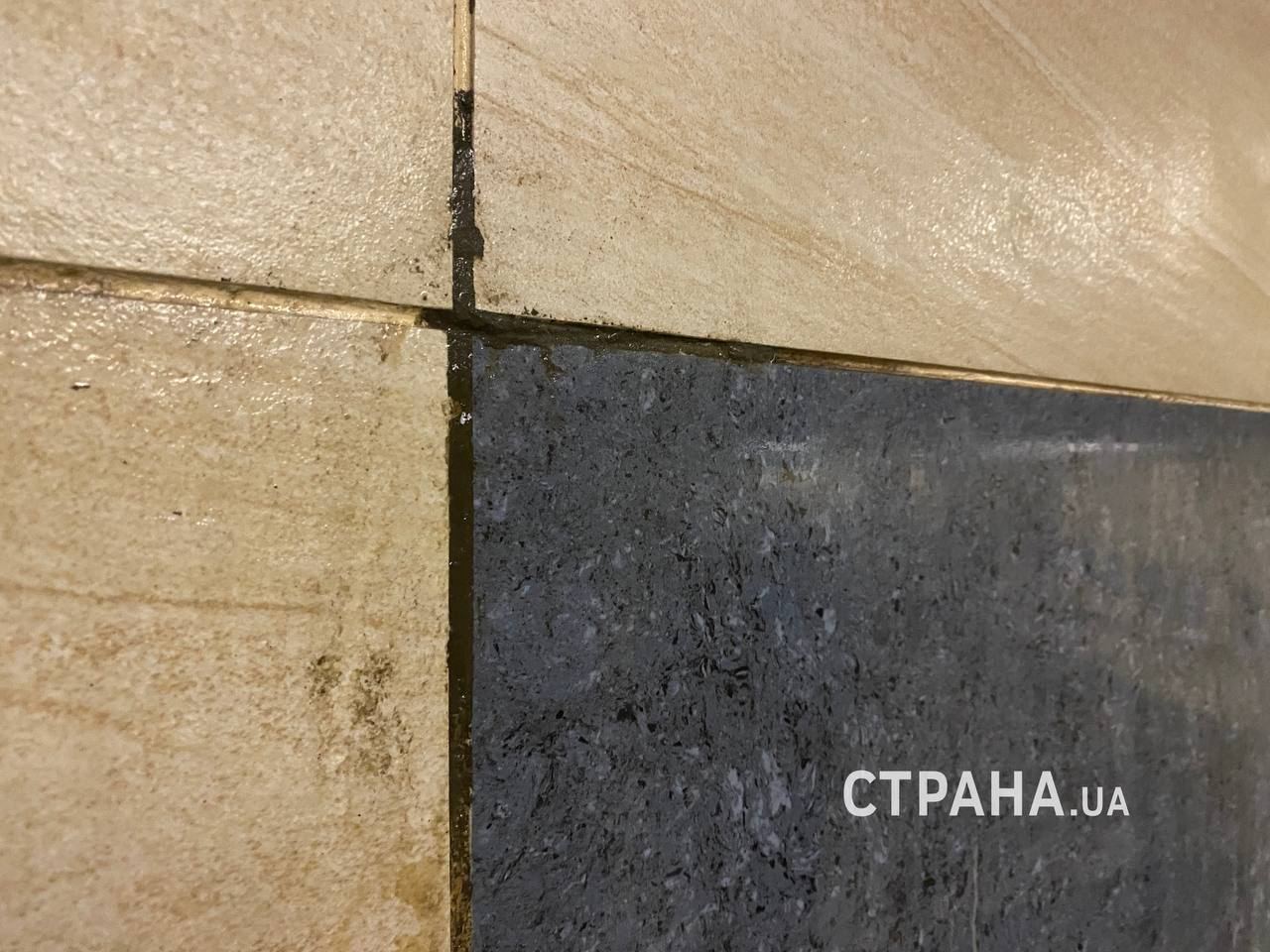 Также сотрудники "Страны" посетили станцию метро "Голосеевская" на закрытой части синей ветки. Вчера в киевских пабликах массово разошлось видео, как из стены между плитками там течет вода. Сегодня дыры, откуда сочилась вода, замазаны цементом, но на фото можно увидеть, что влага уже опять начала просачиваться: по стенам текут мелкие ручейки воды. На потолке отваливается штукатурка.