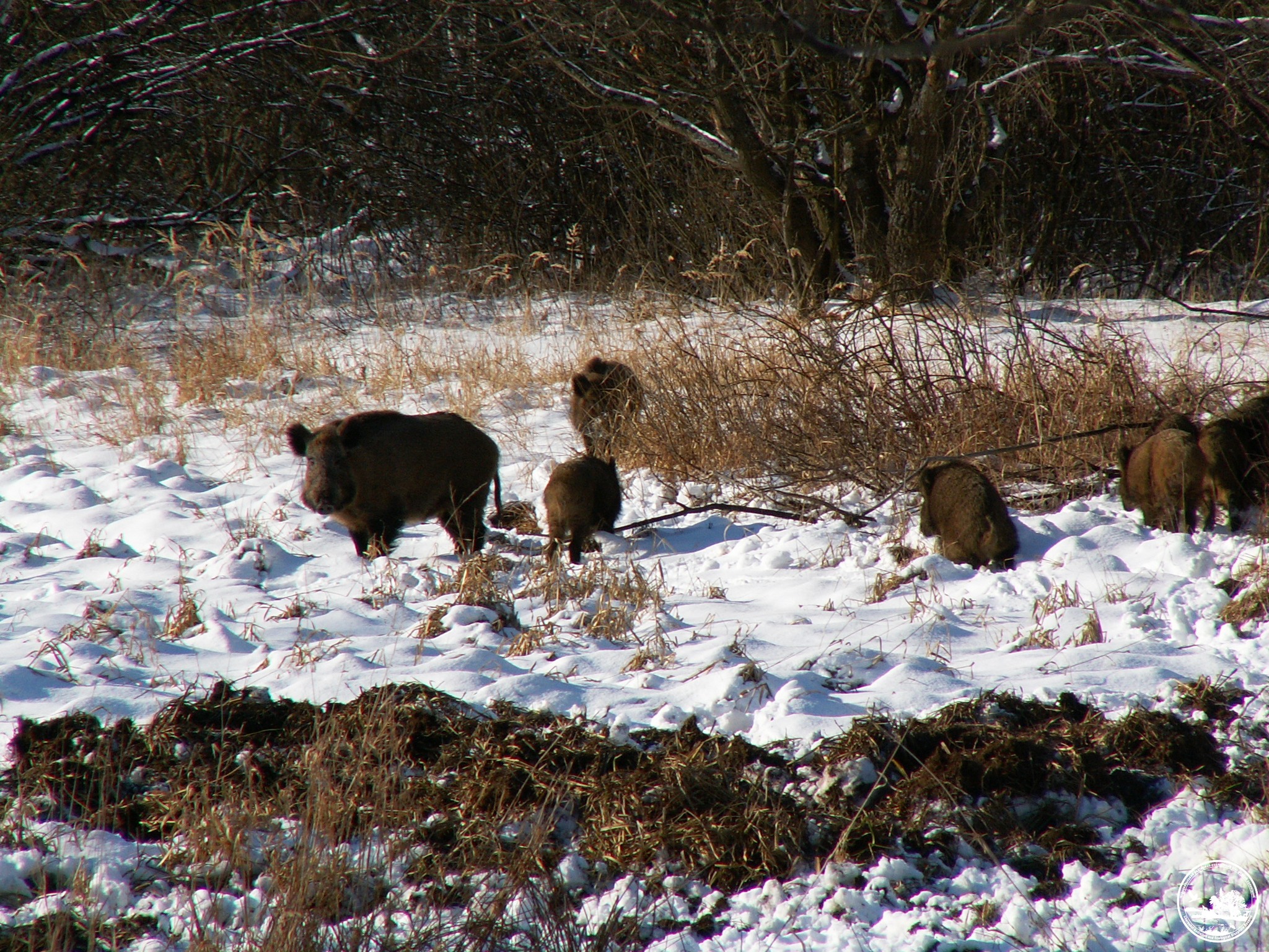 На третьем фото стадо кабанов. В этой группе диких свиней секачей (так называют взрослых кабанов, имеющих нижние и верхние клыки, которые с возрастом становятся острее) не видно. Очевидно, у этого стада матриархат. У самок клыки меньше, поэтому они не атакуют ими врага, как самцы, а кусают и топчут его копытами.