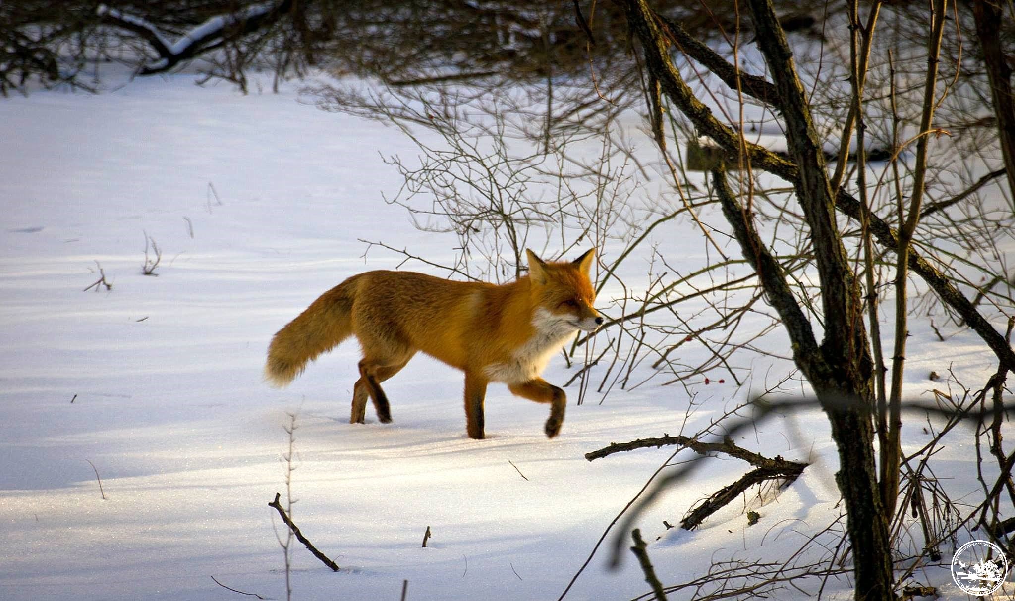 На втором снимке изображена лиса. У лисы прекрасные обоняние и слух. Зимой рыжая хищница внимательно прислушивается к разным звукам и безошибочно определяет, где под снегом спрятался какой-нибудь мелкий грызун.