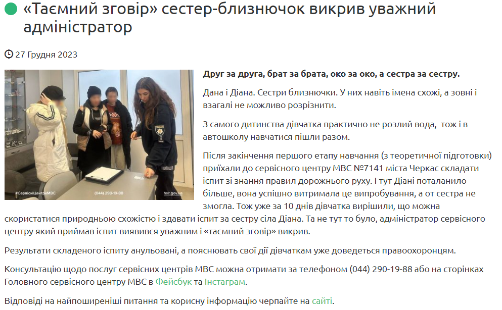 В Черкассах разоблачили девушку, которая пришла сдавать экзамен на права за свою сестру-близняшку.