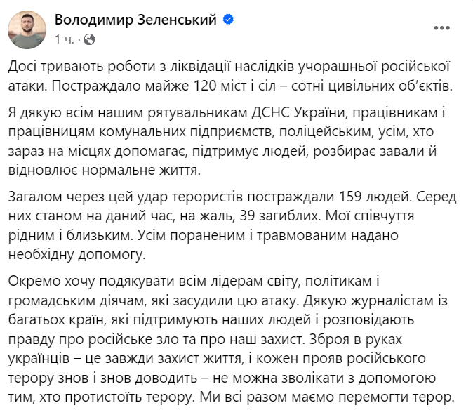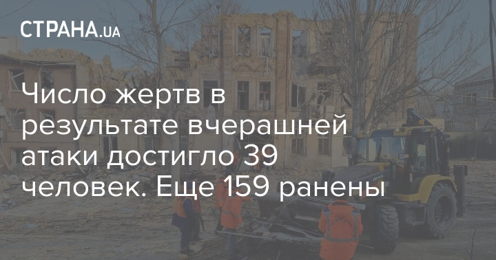 Президент Украины Владимир Зеленский заявил, что число жертв в результате вчерашней атаки достигло 39 человек.
