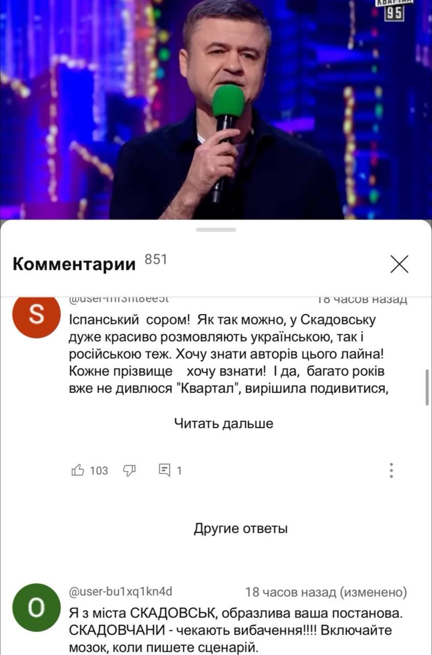 Однако в интернете номер вызвал шквал критики в адрес "Квартала 95". В частности, мэр Скадовска Александр Яковлев выступил с заявлением против такого рода шуток в отношении скадовчан, которые нуждаются в поддержке.