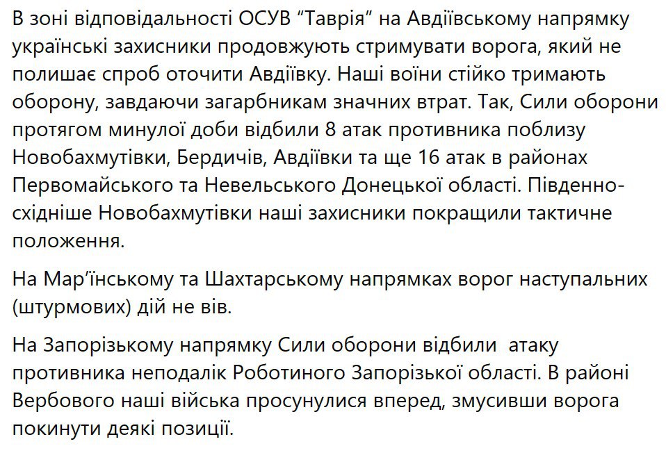 Также в утренней сводке говорится, что в районе Вербового Запорожской области "войска продвинулись вперед, заставив врага покинуть некоторые позиции".