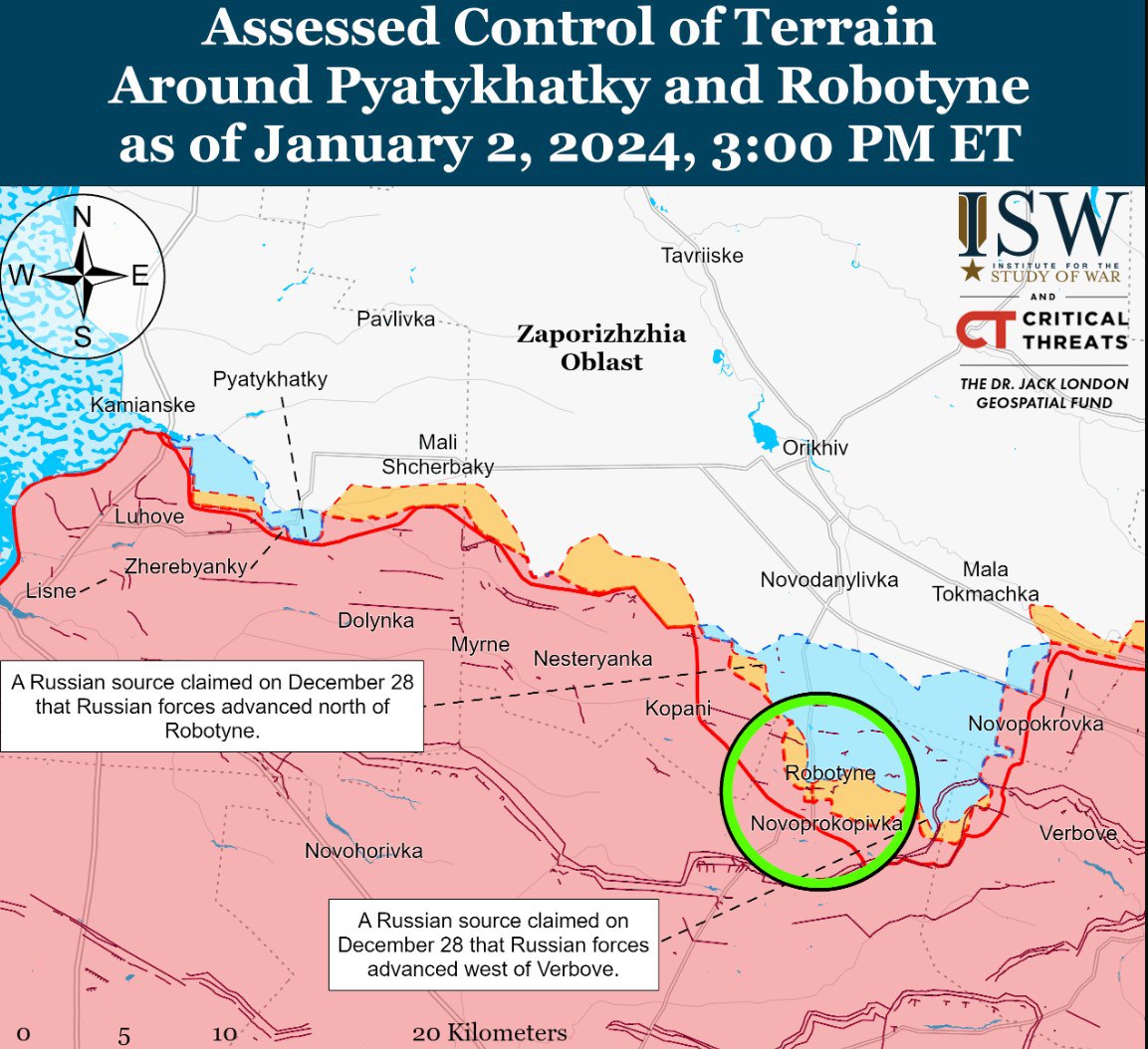 При этом "Институт" сообщает, что россияне продвинулись на западе от села Работино со стороны Копаней и атакуют со стороны Новопрокоповки (к югу от Работино).