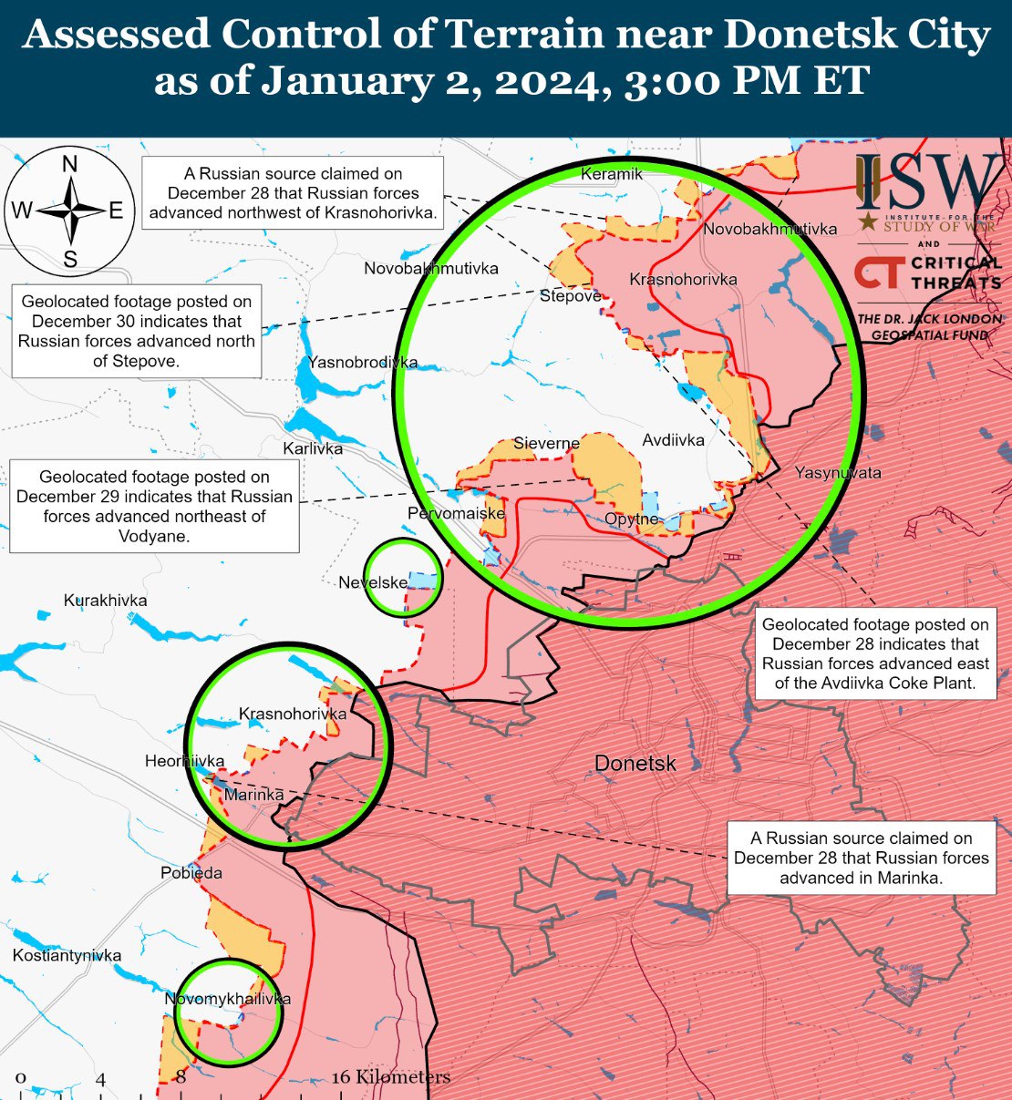 Что же до авдеевского участка, то, как пишет "Институт" в своей утренней сводке,  "российские войска недавно совершили подтвержденное наступление к северо-западу от Авдеевки" и продвинулись к северо-западу от Степного.