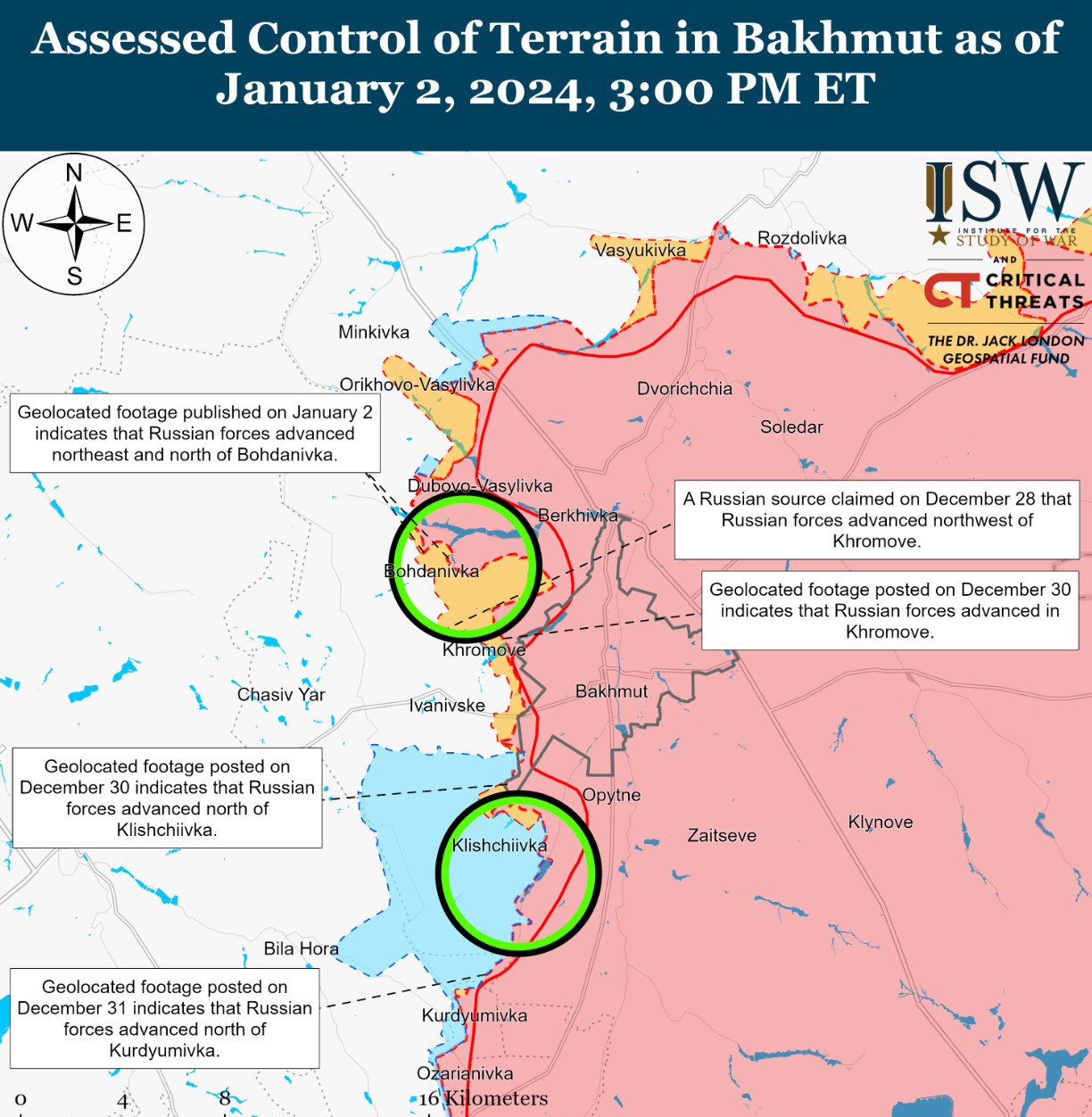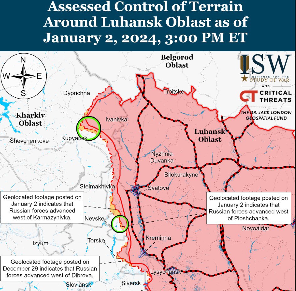 Также, как пишет ISW, российские войска продвинулись к северо-западу и юго-западу от Бахмута. На кадрах, опубликованных 1 и 2 января, видно, что российские войска наступали на северную и восточную окраину Богдановки и продвинулись севернее Курдюмовки.