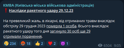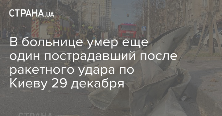После обстрела Киева 29 декабря в больнице умер еще один человек. Таким образом количество погибших после очередной ракетной атаки рф выросло до 30 человек.