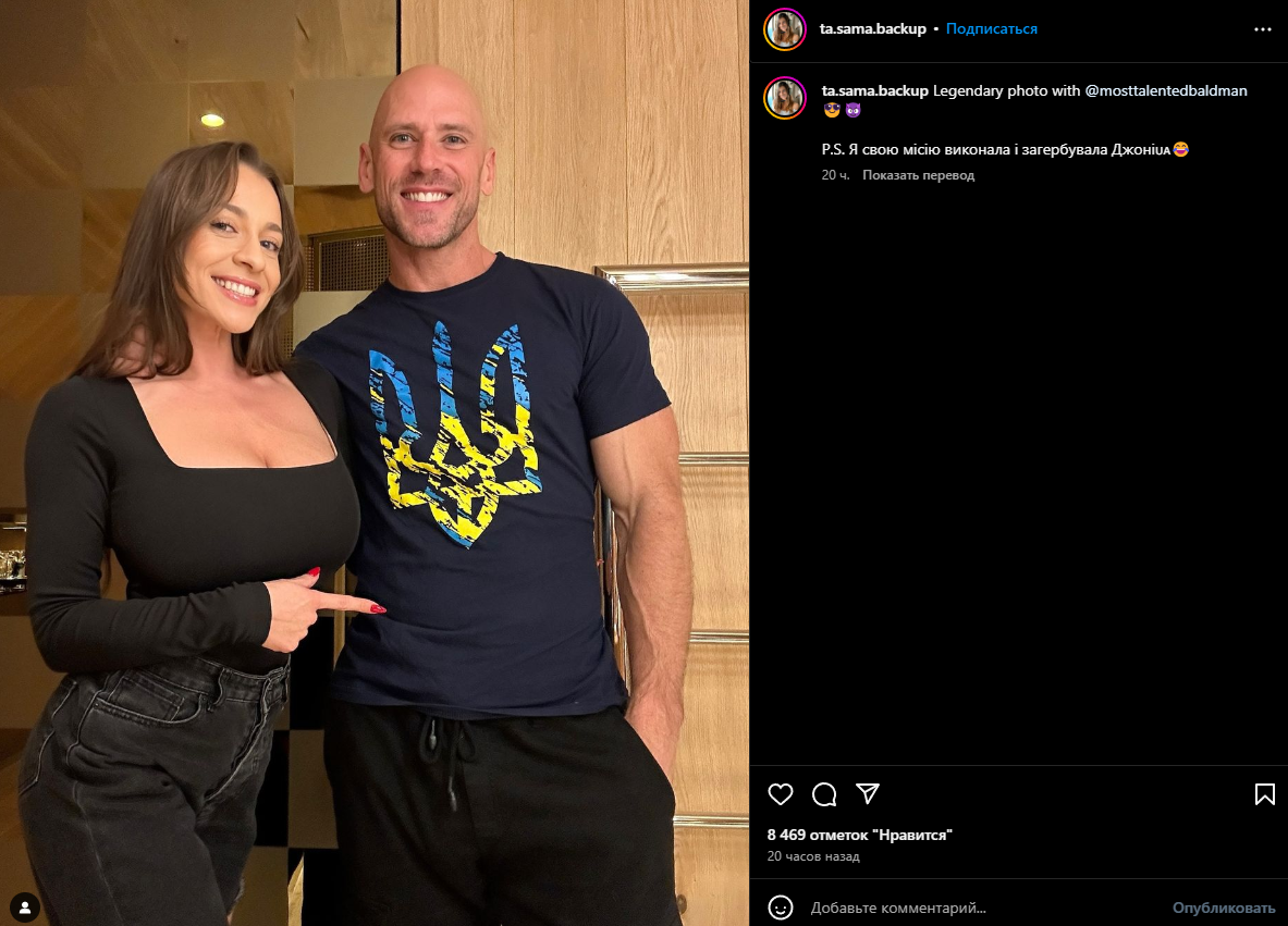 Порноактер Джонни Синс, известный как лысый из Brazzers (название известной порностудии), сфотографировался в футболке с гербом Украины. Футболку ему подарила украинская порноактриса Юлия Сенюк, прославившаяся в индустрии под псевдонимом Джозефина Джексон.