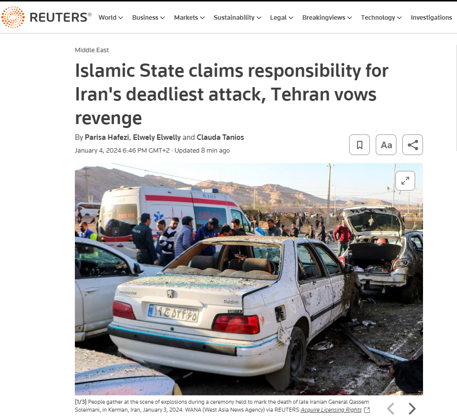 Они сообщили, что двое членов Исламского государства взорвали пояса со взрывчаткой в ​​толпе, собравшейся в среду на кладбище в юго-восточном иранском городе Керман в годовщину смерти Сулеймани.