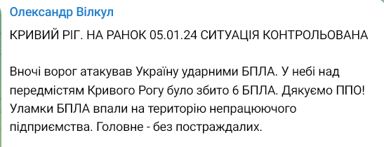 Ночью 5 января над Кривым Рогом в Днепропетровской области силы ПВО сбили шесть российских беспилотников. Обломки дронов упали на территорию неработающего предприятия.