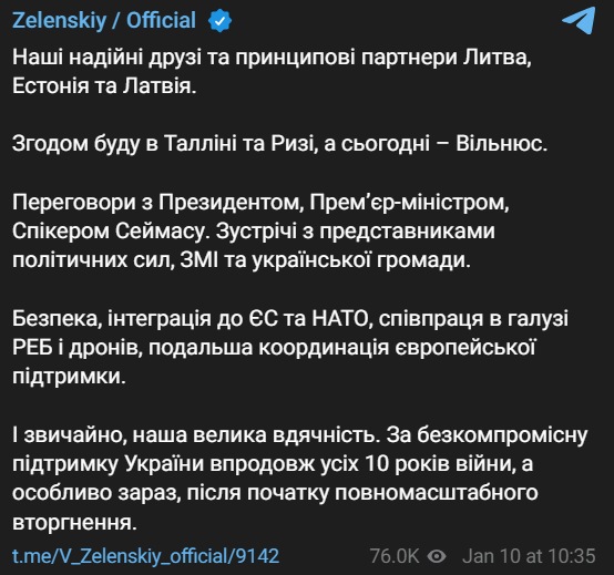 Сегодня, 10 января, президент Украины Владимир Зеленский прибыл с рабочим визитом в столицу Литвы Вильнюс.