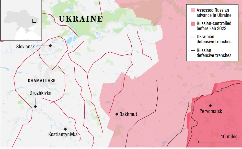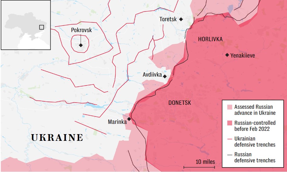 Еще одна линия - в городе Покровске, "который России необходимо захватить, чтобы выполнить свою задачу по захвату всей Донецкой области". Покровск защищен двухуровневой системой траншей, проходящей по всему городу.