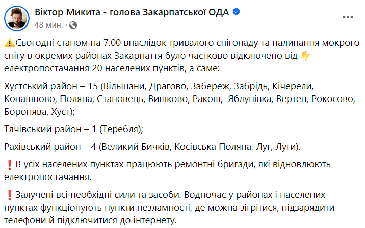 "В настоящее время на местах повреждений работают ремонтные бригады. В районах и населенных пунктах функционируют "пункты несокрушимости", - сообщил глава Закарпатской ОВА.