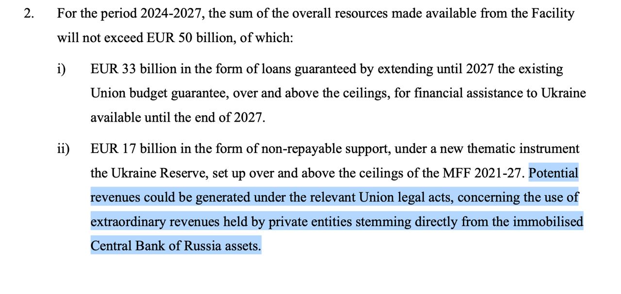 "Потенциальные доходы могут быть получены в соответствии с соответствующими правовыми актами Союза, касающимися использования чрезвычайных доходов частных организаций, полученных непосредственно от замороженных активов Центрального банка России", - говорится в документе.