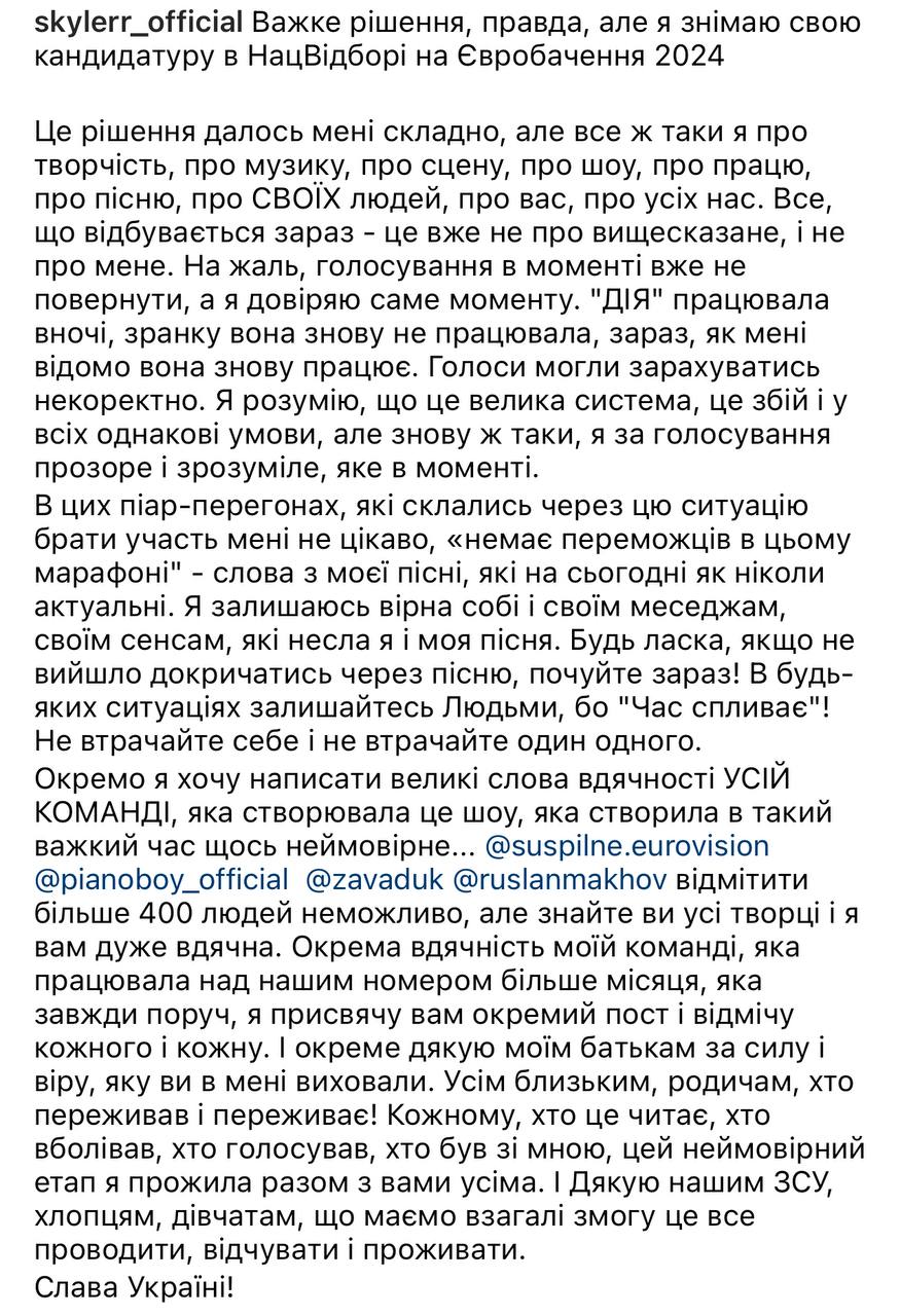 Певица SKYLER сняла свою кандидатуру с Нацотбора на Евровидение из-за сбоя работы "Дии"