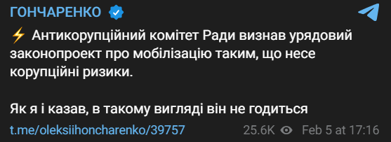 17:31 Антикоррупционный комитет Рады признал правительственный законопроект о мобилизации "несущим коррупционные риски", сообщает нардеп Гончаренко.