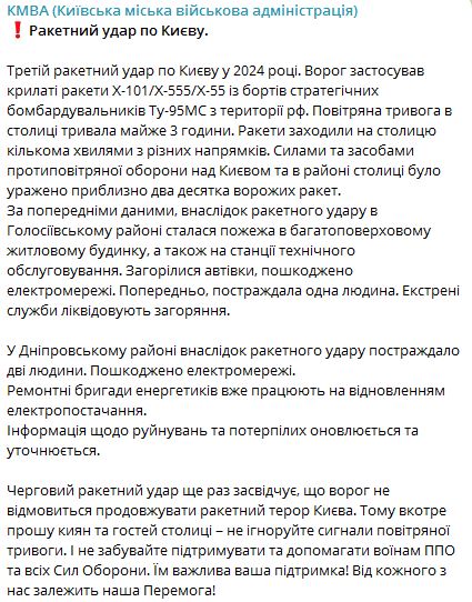 По предварительным данным, в результате ракетного удара в Голосеевском районе произошел пожар в многоэтажном жилом доме, а также на станции технического обслуживания. Загорелись автомобили, повреждены электросети. Предварительно пострадал один человек. Экстренные службы ликвидируют возгорание.